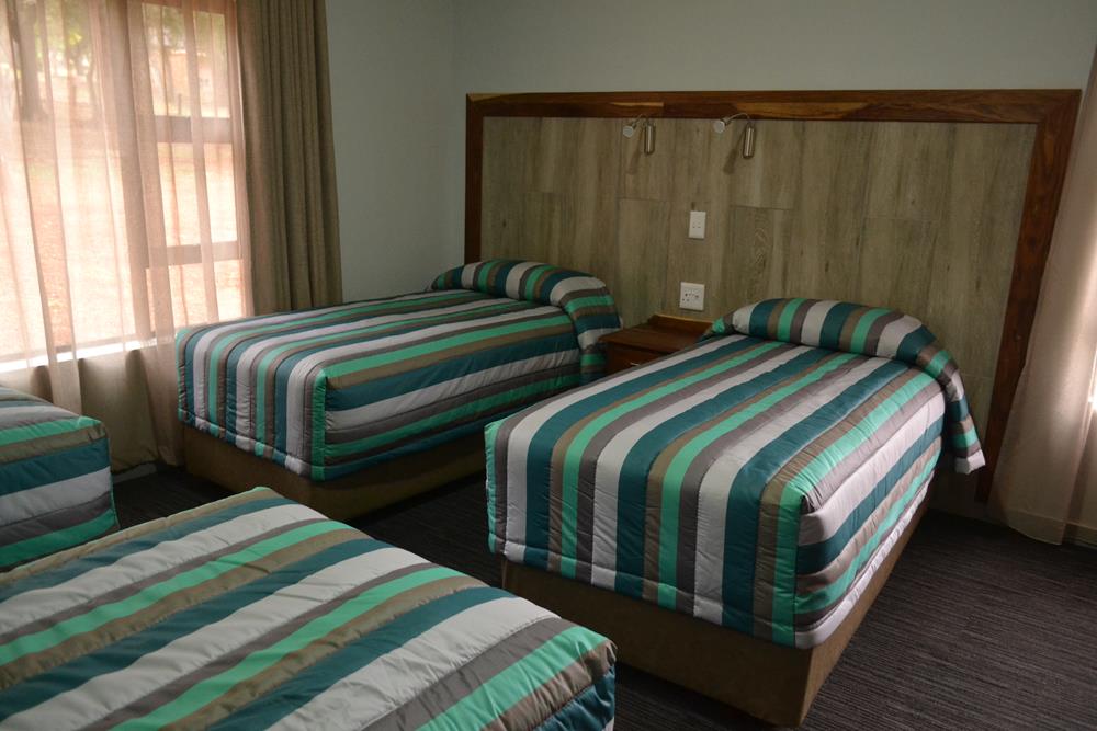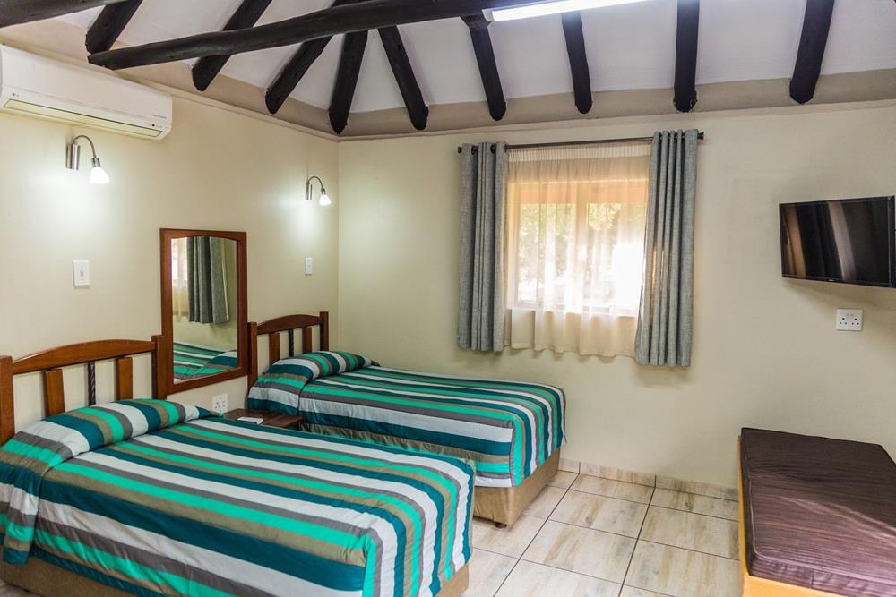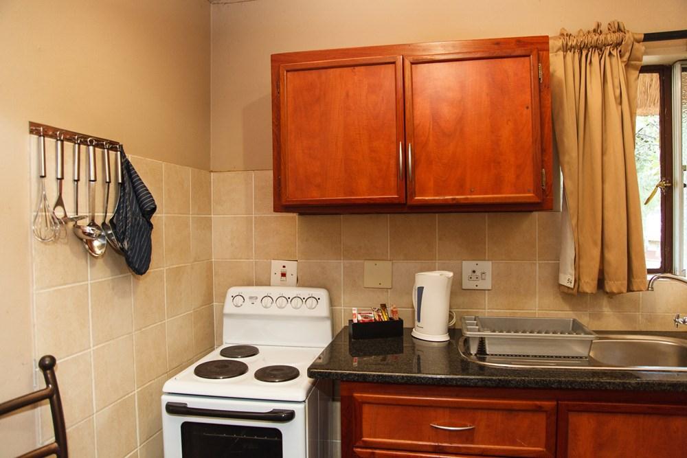 Open plan / 2 sleeper chalet. Open plan chalet with 2 x single beds, open plan kitchen fully equipped with basic crockery and cutlery (for 2 people), cooking utensils, stove, oven, fridge and microwave. Bathroom with a shower. TV (16 selected DSTV Channels), Air-Conditioner and Braai area. Max 2 people.