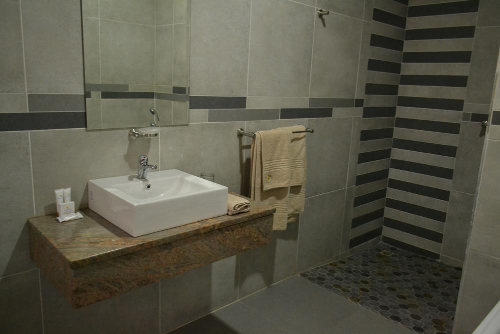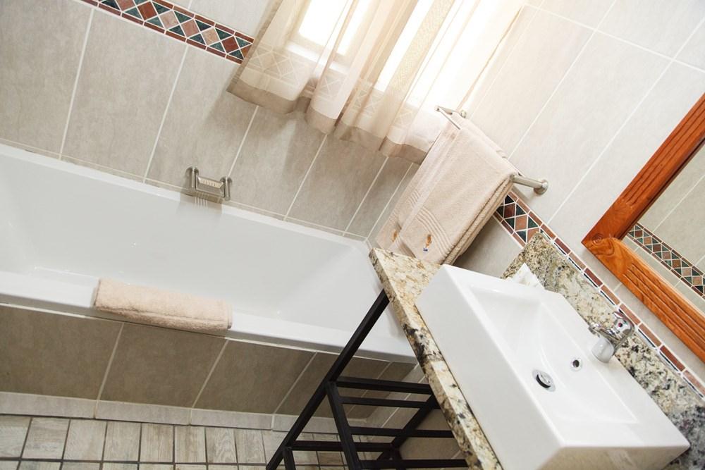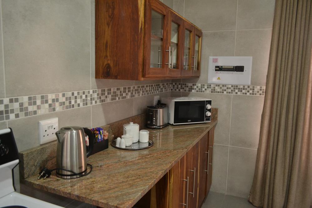 2 bedroom / 4 sleeper chalet: Main Room: 1 x double bed with en-suite bathroom with a bath, shower, basin and toilet. 2nd Room:1Single bed and 1 x bunk bed set with en-suite bathroom with a shower, basin and toilet. Kitchen fully equipped with basic crockery and cutlery (for 5 people), cooking utensils, stove, fridge and microwave. Lounge with a TV (16 selected DSTV channels), Air-Conditioner and Braai area. Max 5 people. Top bunk for child under 12.